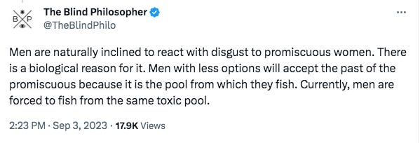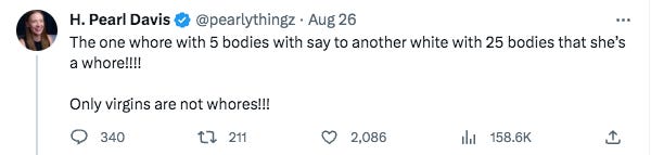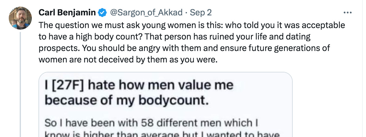 All these guys (and some gals)—from Benjamin to Pool to trad-influencer/Hitler songwriter Pearl Davis (seriously, she wrote a song about maybe believing Hitler conspiracy theories), to British sleaze-influencer Andrew Tate—are arguing that if women have a lot of sexual partners, that’s bad. It makes them “low value.”
