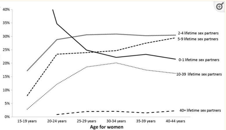 This proves that much of body count discourse is fed by young men who haven’t had any sex. They spew lurid hate fantasies of wild women with dozens of partners, but that rarely happens. This National Institute of Health survey shows that the most common number of lifetime sexual partners for women at age 44 is 2 to 4, followed closely by 5 to 9. Forty or more sexual partners is incredibly rare. Less than 2% of all women claim that rate.