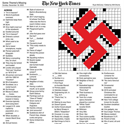 On Sunday, December 18, the New York Times made a crossword puzzle that sent people ballistic. Instead of an array of clever and annoying word clues,1 some observers saw a swastika.