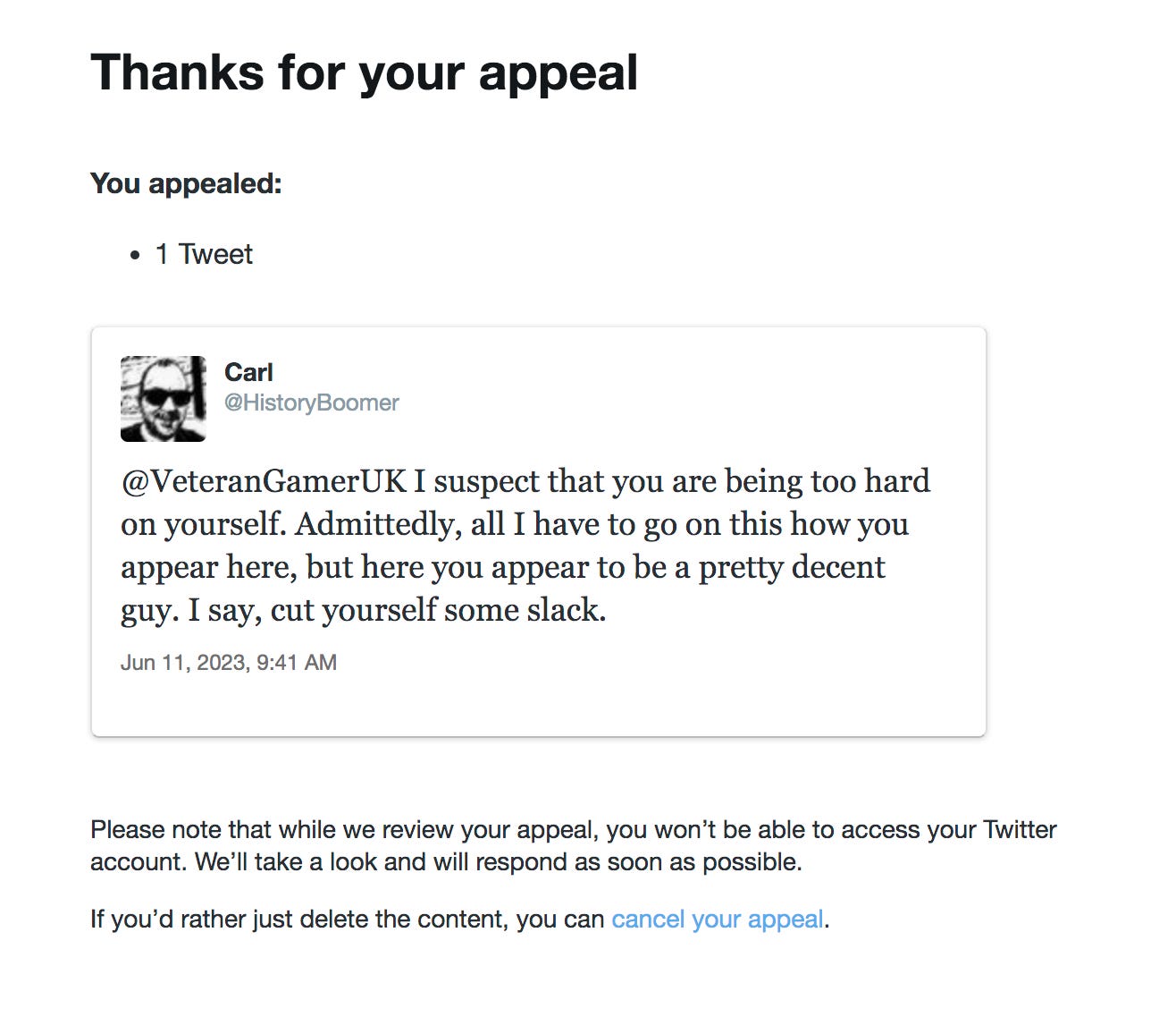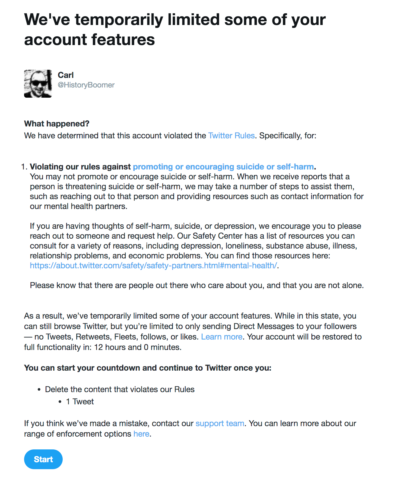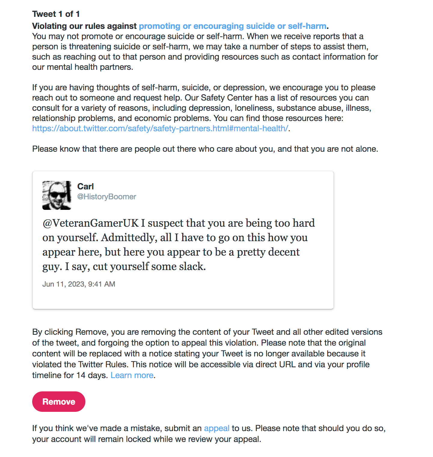 EDIT: 12 hours or so later, Twitter tells me that their careful moderation team (AKA a bunch of clueless weasels) has confirmed that I was encouraging self-harm. Either they’re all bots, they hate America, or they’re drunk on bad whiskey, but I’m up against the wall here. I have no other option but to lie and falsely admit that I’ve violated the rules and delete the tweet.