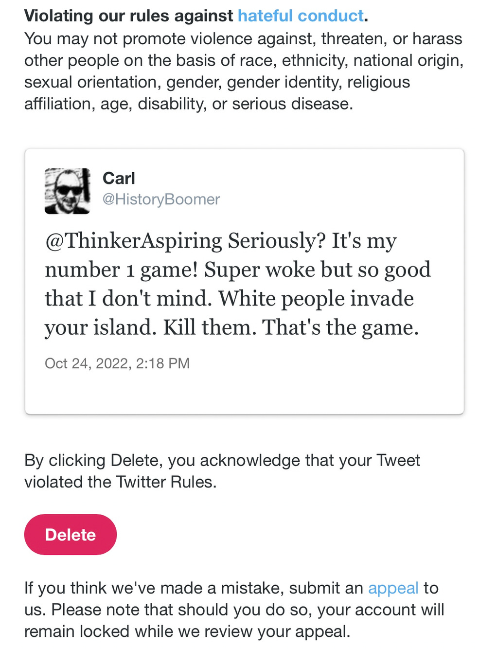 I can get back in Twitter’s good graces by deleting the tweet but that would require me to admit that it violated the Twitter Rules, which it didn’t! Of course, by refusing to delete I have had my account put into complete lockdown while they review my appeal. Oy. I will delete if I gotta, but I’m seeing if they have any sane actual humans who review these things.