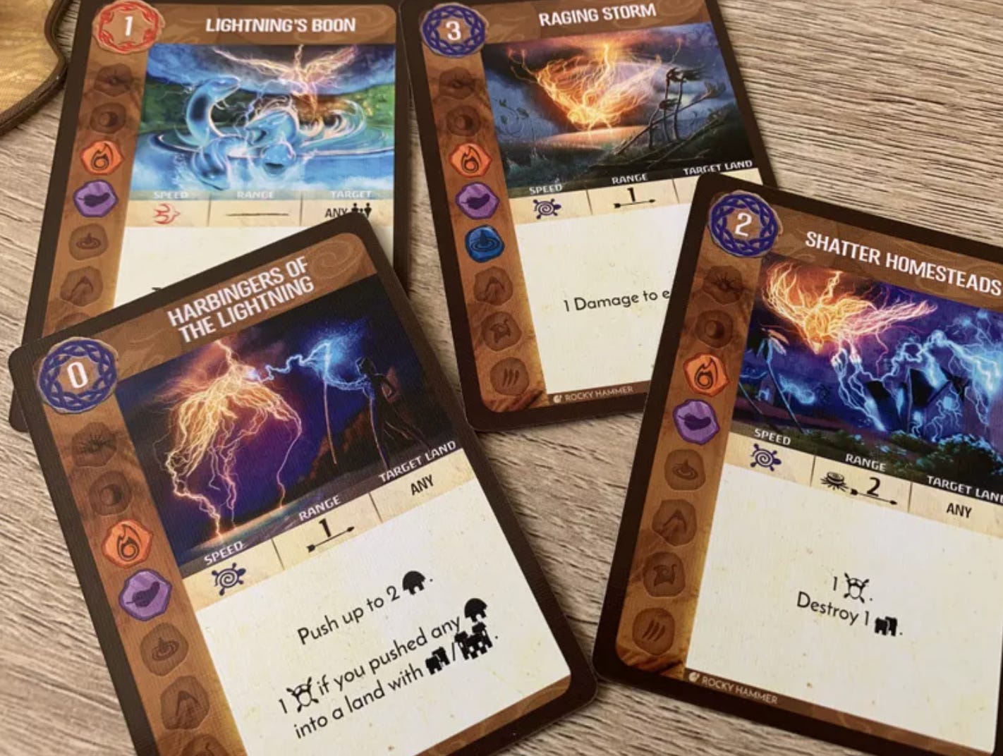 There they are, little white guys all over the map, popping up like wack-a-moles each turn. To destroy them, you use your powers to crush, burn, poison, etc (each spirit has its own specialty). The spirits are represented by those colored round circles, plus their power cards, shown below.
