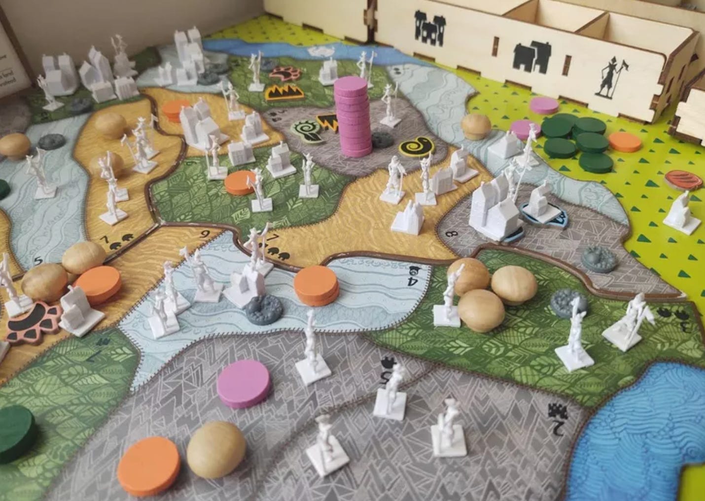 By the way, when I called the game “woke,” I meant it. The designer, Eric Reuss, has made it clear he was designing the anti-settler game in contrast with other very popular settler games, like Catan and Puerto Rico. I don’t mind, it’s just a game. Even the design of the pieces is kinda progressive. The invaders and pollution circles (yes, the game is also pro-environment and the white guys do a LOT of polluting) are unnatural plastic, the spirits and the native villages are made of good wholesome wood!